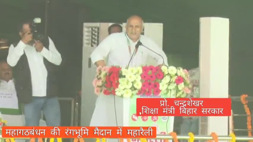 महागठबंधन रैली को संबोधित करते हुए बिहार के शिक्षा मंत्री प्रो चन्द्रशेखर यादव