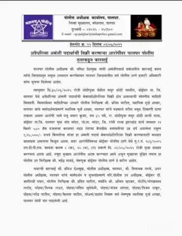 अवैद्यरित्या अमली पदार्थाची विक्री करणाऱ्या आरोपीवर पालघर पोलीस दलाकडून कारवाई.