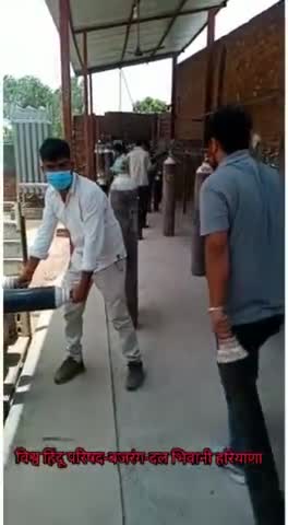 सिविल अस्पताल में ऑक्सीजन सिलेंडर सेवा करते हुए बजरंगदल के कार्यकर्ता।