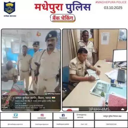 पुलिस अधीक्षक मधेपुरा के निर्देशानुसार बैंकिंग प्रतिष्ठानों में सुरक्षा व्यवस्था को सुनिश्चित करने हेतु बैंकों की सुरक्षा /जांच की जा रही हैं। बैंक के अंदर एवं बाहर संदिग्धों पर निगरानी रखी जा रही हैं।