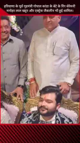 हरियाणा के पूर्व गृहमंत्री गोपाल कांडा के बेटे के रिंग सेरेमनी मनोहर लाल खट्टर और एक्ट्रेस जैकलीन भी हुई शामिल। इस रिंग सेरेमनी में राजनीति के दिग्गजों के साथ-साथ बॉलीवुड जगत के लोगों ने भी हरकत की