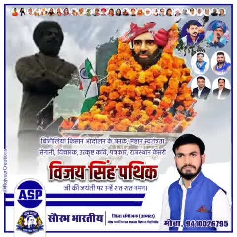 महान स्वतंत्रता सेनानी, विचारक, उत्कृष्ट कवि, पत्रकार, राजस्थान केसरी, विजय सिंह पथिक जी की जयंती पर उन्हें शत-शत नमन।