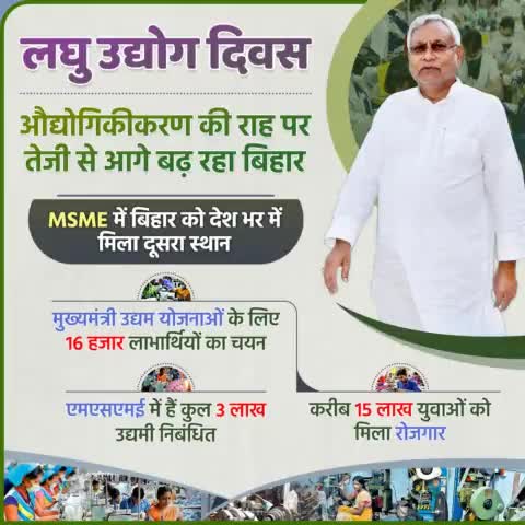 उद्यमिता की राह पर तेजी से आगे बढ़ रहा बिहार... मुख्यमंत्री उद्यम योजनाओं के लिए राज्य में 16 हजार लाभार्थियों का हुआ चयन। #लघु_उद्योग_दिवस #Bihar