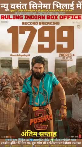 न्यू वसंत सिनेमा भिलाई में "पुष्पा-2" अंतिम ७ दिन रोज़ाना ३ शौ सुबह-१२, शाम-४ और रात्रि-८:३० बजे अंतिम सप्ताह सबसे कम टिक