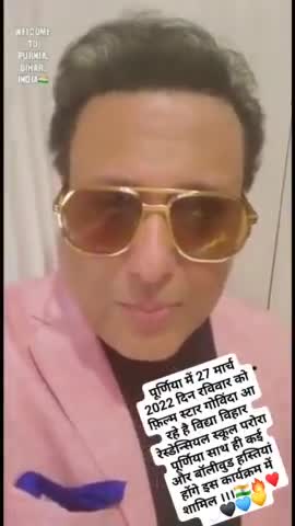 पूर्णिया में 27 मार्च को फ़िल्म स्टार गोविंदा आ रहे है कई और बॉलीवुड हस्तियां होंगे इस कार्यक्रम में शामिल ।।🇮🇳🔥♥️