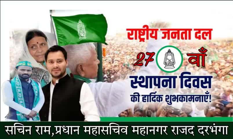 राष्ट्रीय जनता दल के 27वां स्थापना दिवस की हार्दिक शुभकामनाएं सचिन राम,प्रधान महासचिव महानगर राजद दरभंगा।