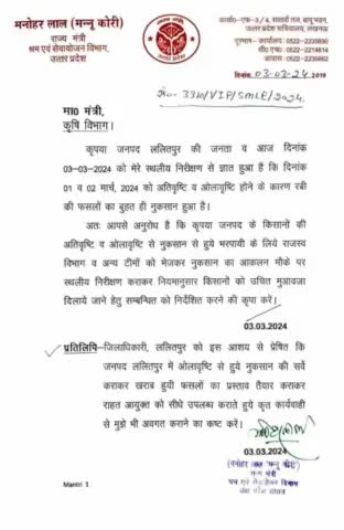 007 बे मौसम बरसात की वजह से किसानो की रबी फसल को हुए नुकसान के संबंध में राज्य मंत्री ने कृषि मंत्री व डीएम को लिख पत्र