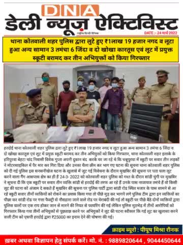 हरदोई थाना कोतवाली शहर पुलिस द्रारा लुटे हुए ₹1लाख 19 हजार नगद व लूटा हुआ अन्य सामान 3 तमंचा 6 जिंदा व दो खोखा कारतूस एव