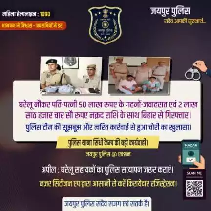 घरेलू नौकर पति-पत्नी 50 लाख के गहनों एवं 260400 रुपए नक़द के साथ बिहार से गिरफ्तार। पुलिस थाना सिंधी कैम्प की बड़ी कार्यवाही। अपील : घरेलू सहायकों का पुलिस सत्यापन जरूर कराएं। नज़र सिटीजन एप द्वारा आसानी से करें किरायेदार रजिस्ट्रेशन।