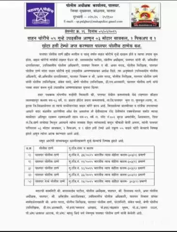 पालघर पोलिसांना वाहन चोरीचे 5 गुन्हे उघडकीस आणण्यात यश.