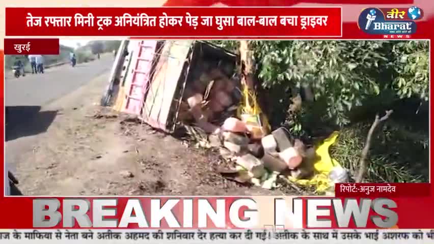 khurai तेज रफ्तार मिनी ट्रक अनियंत्रित होकर पेड़ जा घुसा बाल-बाल बचा ड्राइवर।