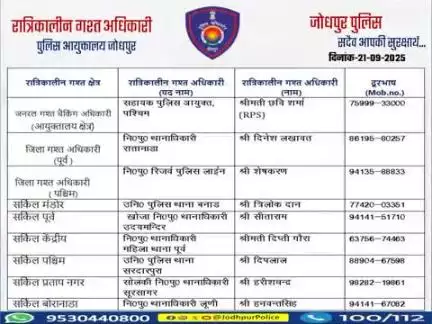 #जोधपुर_पुलिस आयुक्तालय क्षेत्र में निम्न अधिकारियों की #रात्रिकालीन_गश्त 12 AM से 05 AM तक रहेगी। रात्रि में किसी प्रकार की सहायता के लिए निम्न अधिकारियो से संपर्क कर सकते हैं। आपकी सुरक्षा हमारी प्राथमिकता है।