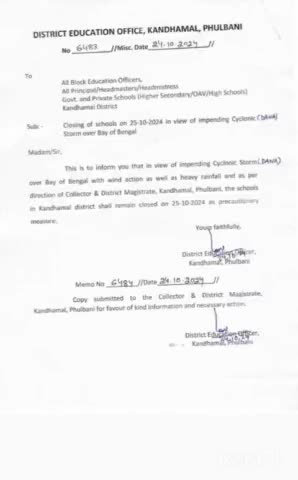 ଆଜି ତାରିଖ 24/10/2024 ସମୟ ଅପରାହ୍ନ ତିନିଟା ବେଳେ କନ୍ଧମାଳ ଜିଲ୍ଲା ଶିକ୍ଷା ଅଧିକାରୀ ଚିଠି ମାଧ୍ୟମରେ ଜିଲ୍ଲାର ସମସ୍ତ ସରକାରୀ ଏବଂ ବେସରକାରୀ ଶିକ୍ଷାନୁଷ୍ଠାନ ଗୁଡ଼ିକ ବନ୍ଦ କରିବା ପାଇଁ ନିର୍ଦ୍ଧେଶ ଦେଲେ କନ୍ଧମାଳ ଜିଲ୍ଲା ଶିକ୍ଷା ଅଧିକାରୀ।