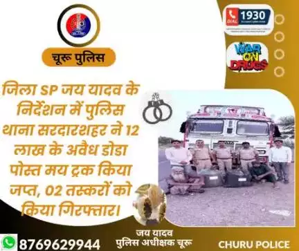 जिला SP जय यादव के निर्देशन में PSसरदारशहर ने 12 लाख के अवैध डोडा पोस्त मय ट्रक किया जप्त, 02 तस्करों को किया गिरफ्तार।