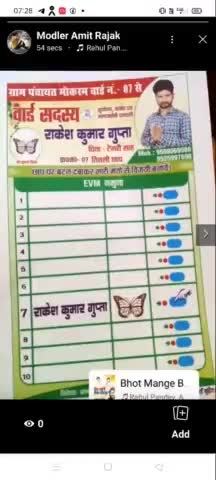 मोकरम वार्ड नंबर7 के प्रत्याशी राकेश कुमार गुप्ता चुनाव चिन्ह तितली छाप क्र संख्या 7 के सामने वाला बटन दबाकर भारी मतों