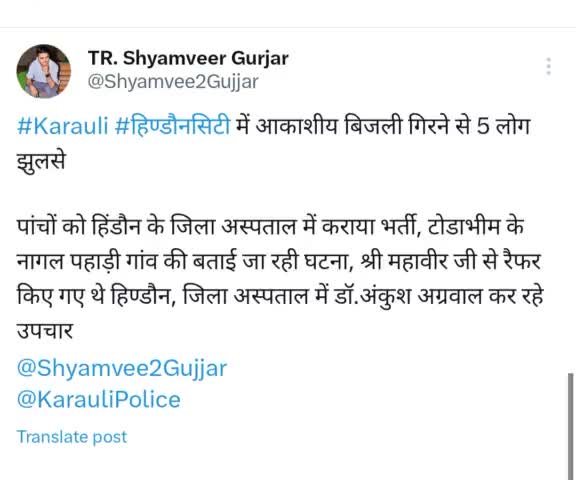 #Karauli #हिण्डौनसिटी में आकाशीय बिजली गिरने से 5 लोग झुलसे टोडाभीम के नांगल पहाड़ी गांव की बताई जा रही है घटना