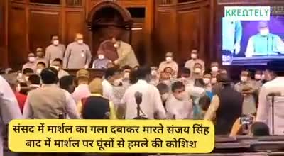 संसद में मार्शल का गला दबाकर मारते आम आदमी पार्टी के सांसद #संजय_सिंह , बाद में घूंसों से मार्शल पर हमला भी किया...!!