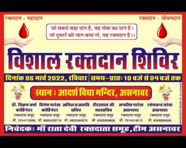 असनावर मैं आज मां राता देवी रक्तदाता समूह के द्वारा विशाल रक्तदान शिविर का आयोजन कोऑर्डिनेटर विक्रम वर्मा व दीपेश पारेत