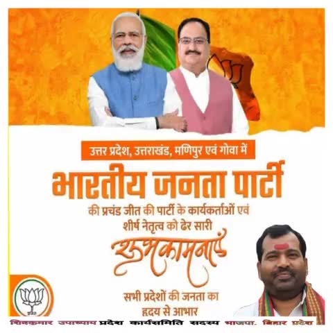 लोकतंत्र के महायज्ञ में उतर प्रदेश, उत्तराखंड, मणिपुर एवम गोवा इन चार राज्यों में भारतीय जनता पार्टी के प्रचण्ड बहुमत दिलाने के लिए चारों प्रदेशों की जनता जनार्दन, नेतागणों और कार्यकर्ताओं को कोटिशः प्रणाम और बधाइयाँ।।👏👏💐💐