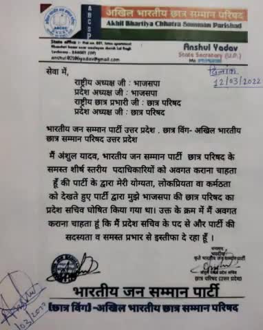 मैंने आज भारतीय जन सम्मान पार्टी से इस्तीफा दे दिया है ,राष्ट्रीय अध्यक्ष जी को बहुत-बहुत धन्यवाद करूंगा