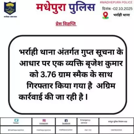 भर्राही थाना अंतर्गत गुप्त सूचना के आधार पर एक व्यक्ति बृजेश कुमार को 3.76 ग्राम स्मैक के साथ मधेपुरा पुलिस ने किया गिरफ्तार , अग्रिम कार्रवाई की जा रही है I
