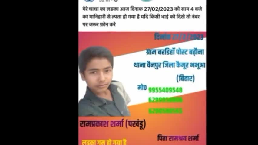 चैनपुर: लापता हुआ विद्यायल से एक विद्यार्थी नाम रामप्रकाश शर्मा मिलने पर संपर्क करें 7061039227