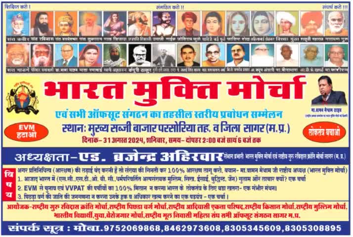 चलो गांव की ओर जीवन संदेश महापुरूषों के तहत आज कार्यक्रम परसोरिया नरयावली विधानसभा सागरmpक्षेत्र में आप सभी समाजिक संगठन के कार्यकर्ता सादर आमंत्रित हैं। विभिन्न विषयों चर्चा होगी एड.बृजेन्द्र अहिरवार समाज कार्यकर्ता सागर