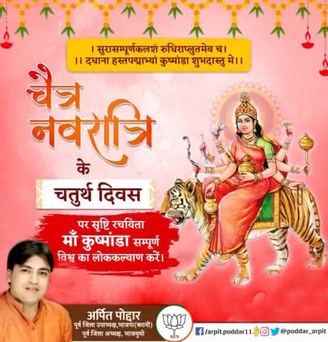 चैत्र नवरात्रि के चतुर्थ दिवस की हार्दिक शुभकामनाएं सभी संकटों, रोग-शोक का समूल नाश कर आयु, यश-कीर्ति एवं सुबुद्धि की प्रदाता माँ कुष्मांडा के चरणों में शत शत नमन🙏 #maakushmanda