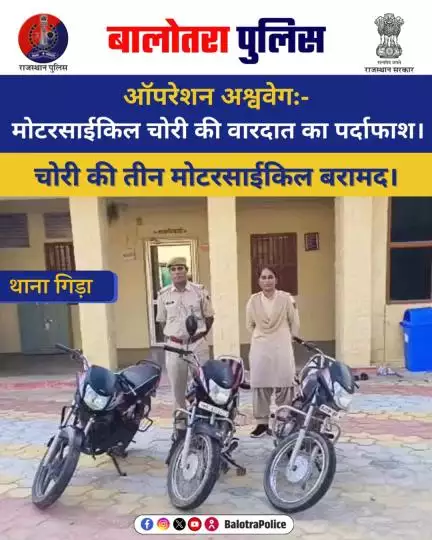 #Balotra: थाना गिडा द्वारा ‘‘ऑपरेशन अश्ववेग’’ के तहत मोटरसाईकिल चोरी की वारदात का पर्दाफाश। 03 मोटरसाईकिल बरामद।