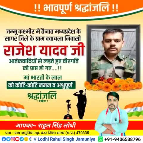 सागर जिले के ग्राम क्वायला निवासी #राजेश_यादव_जी आतंकवादियों से लड़ते हुए वीरगति को प्राप्त हो गए भावपूर्ण श्रद्धांजलि