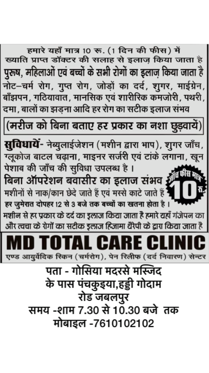 जबलपुर का सबसे सस्ता प्राइवेट स्वास्थ्य केंद्र जहाँ गोल्ड मेडलिस्ट डॉक्टर द्वारा जाँच की जाती है #jabalpurkhabr #jabalpur