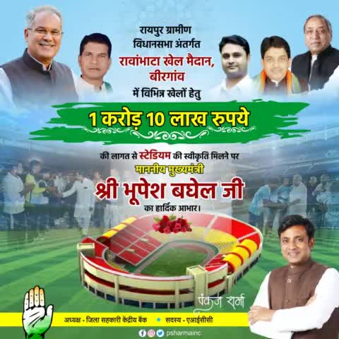 रायपुर ग्रामीण विधानसभा अंतर्गत रावांभाटा खेल मैदान बीरगांव में विभिन्न खेलों हेतु 1 करोड़ 10 लाख रुपये की लागत से स्टेडियम की स्वीकृति मिलने पर माननीय मुख्यमंत्री श्री भूपेश बघेल जी,मा.विधायक सत्यनारायण शर्मा जी का हार्दिक आभार।