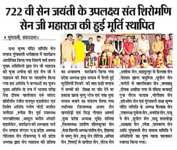 सेन जयंती एवं सेन जी ने महाराज प्रतिमा अनावरण कार्यक्रम मुंगावली