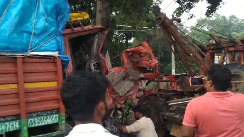 एटा: आगरा रोड़ पर क्रिश्चियन इंटर कॉलेज के सामने दो डीसीएम आमने-सामने भिड़ गई। फसे चालकों को स्थानीय लोगों ने बाहर निकाला#