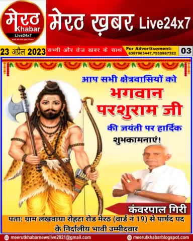 मेरठ । मैं कंवरपाल गिरी वार्ड 19 लखवाया से अपने समस्त से क्षेत्रवासियों को भगवान परशुराम जी के जयंती जन्मदिवस पर (मेरठ खबर लाइव न्यूज़) के माध्यम से हार्दिक शुभकामनाएं देता हूं। Regards प्रवेश कुमार रोहतगी मेरठ ख़बर लाइव न्यूज