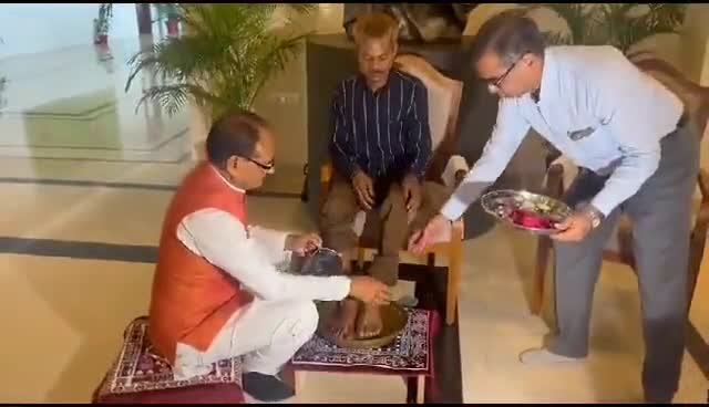 पेशाब प्लांट के आदिवासी की मुख्यमंत्री शिवराज सिंह चौहान पैर धोकर विदाई।
