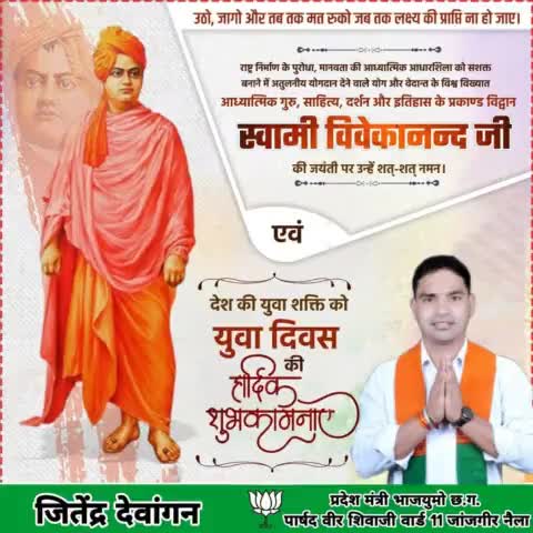 हम वो हैं जो हमें हमारी सोच ने बनाया है, इसलिए इस बात का ध्यान रखिये कि आप क्या सोचते हैं। शब्द गौण हैं, विचार रहते हैं, वे दूर तक यात्रा करते हैं.. स्वामी विवेकानंद 12 जनवरी स्वामी विवेकानंद जी जयंती युवा दिवस की हार्दिक शुभकामनाएं।।।