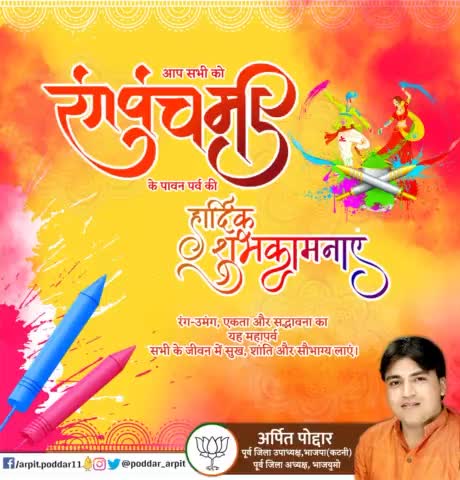 आप सभी को रंगपंचमी के पावन पर्व की हार्दिक शुभकामनाएं। रंग-उमंग, एकता और सद्भावना का यह महापर्व सभी के जीवन में सुख, शांति और सौभाग्य लाएं। #Rangpanchmi