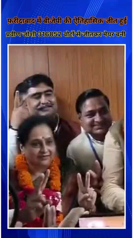 फरीदाबाद में BJP से मेयर प्रत्याशी श्रीमती प्रवीण जोशी ने 3 लाख 16852 वोटों के अंतर से जीत हासिल की। विजेता रही श्रीमती जोशी को रिटर्निंग अधिकारी एवं सीईओ जिला परिषद सतबीर मान ने जीत का सर्टिफिकेट प्रदान किया। इस अवसर पर केंद्रीय राज्य मंत्री श्री कृष्ण पाल गुर्जर व भाजपा जिलाध्यक्ष राज कुमार वोहरा भी मौजूद रहे.नवनिर्वाचित मेयर प्रवीण ने सभी का धन्यवाद किया