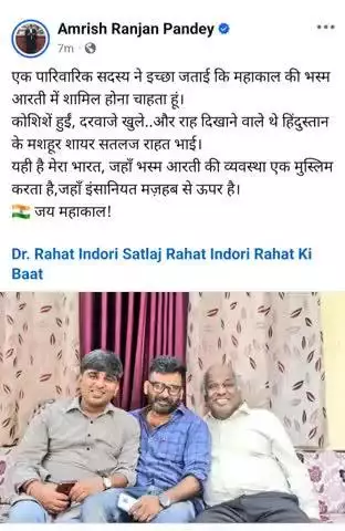 एक पारिवारिक सदस्य ने इच्छा जताई कि महाकाल की भस्म आरती में शामिल होना चाहता हूं। कोशिशें हुईं, दरवाजे खुले..और राह दिखाने वाले थे हिंदुस्तान के मशहूर शायर सतलज राहत भाई। यही है मेरा भारत, जहाँ भस्म आरती की व्यवस्था एक मुस्लिम करता है....