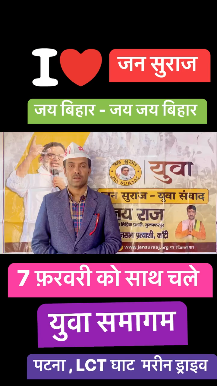 नमस्कार मैं अनय राज जिला डिजिटल मीडिया प्रभारी सह जन सुराज प्रदेश युवा कार्यकारणी सदस्य, आ रहा हूँ कांटी विधानसभा क्षेत्र से ।