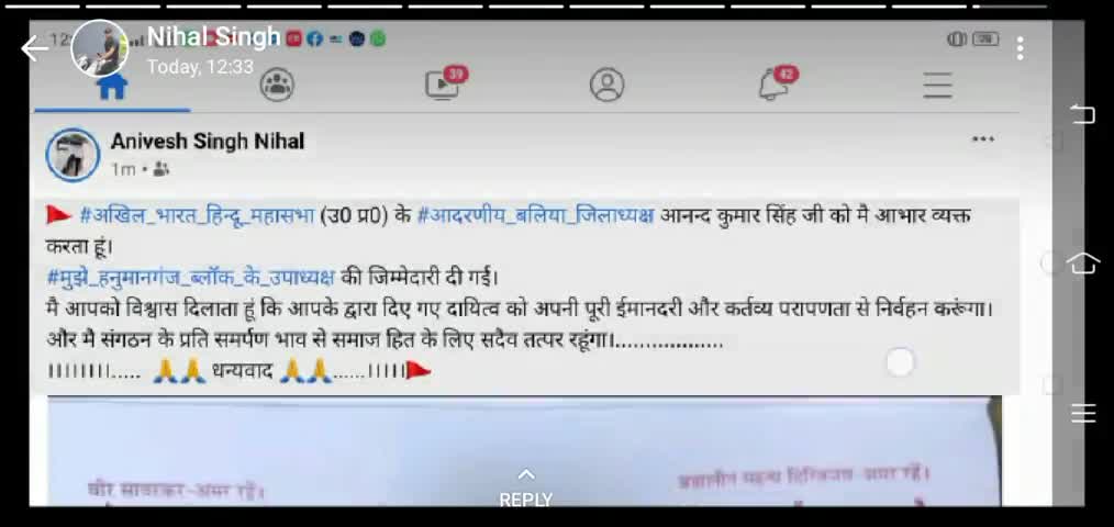 बलिया: 🚩 #अखिल_भारत_हिन्दू_महासभा (उ0 प्र0) के #आदरणीय_बलिया_जिलाध्यक्ष आनन्द कुमार सिंह जी को मै आभार व्यक्त करता हूं।