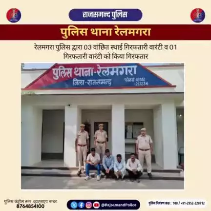 रेलमगरा थाना पुलिस द्वारा 03 वांछित स्थाई वारंटी एवं 01 गिरफ्तार वारंटी को किया गिरफ्तार