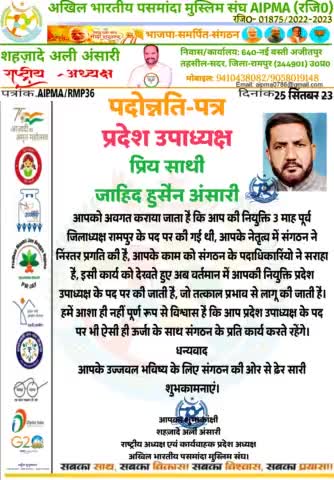 पदोन्नति-पत्र, प्रदेश उपाध्यक्ष जाहिद हुसैन अंसारी के द्वारा संगठन के प्रति समर्पित कार्यों को देखते हुए रामपुर के जिलाध्यक्ष के पद से पदोन्नति करते हुए प्रदेश उपाध्यक्ष के पद पर नियुक्त किया गया है...।
