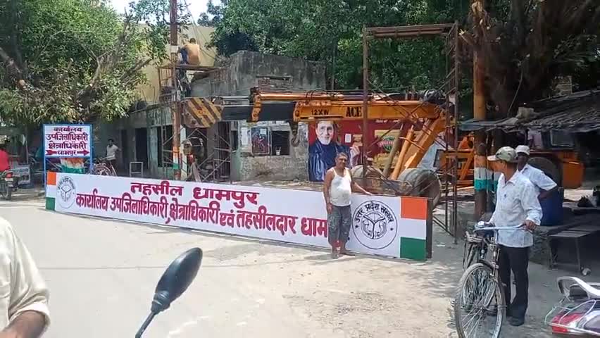 धामपुर तहसील परिसर के बाहर गेट पर तहसील परिसर का मुख्य गेट लगाया गया बोर्ड