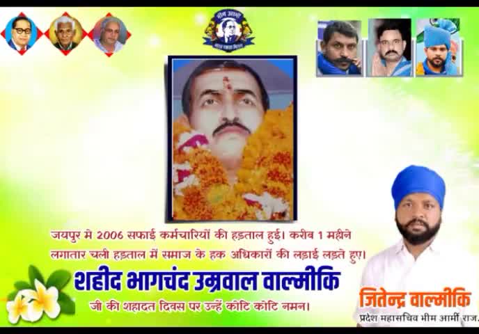 जयपुर मे 2006 सफाई कर्मचारियों की हड़ताल हुई। करीब 1 महीने लगातार चली हड़ताल में समाज के हक अधिकारों की लड़ाई लड़ते हुए। शहीद भागचंद उम्रवाल वाल्मीकि