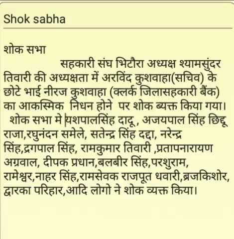 नीरज कुशवाहा के आकस्मिक निधन पर शोक व्यक्त किया गया--श्यामसुन्दर तिवारी (अध्यक्ष सहकारी संघ भिटौरा)