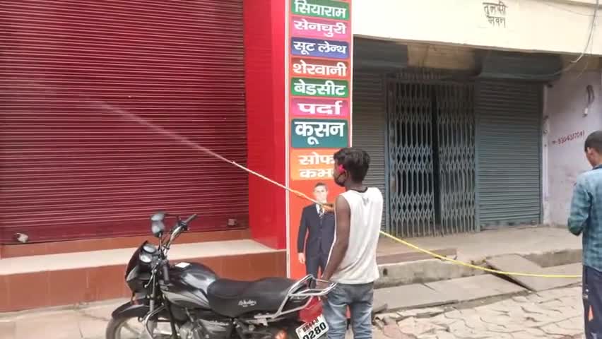 बक्सर: नगर परिषद द्वारा मुनीब चौक पर बनी दुकानों पर कराया गया सैनिटाइजर का छिड़काव
