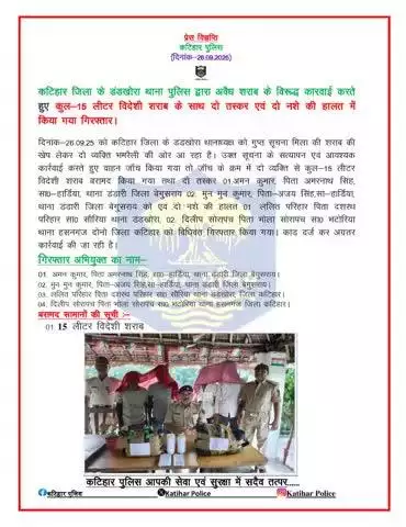 कटिहार जिला के डंडखोरा थाना पुलिस द्वारा अवैध शराब के विरूद्ध कारवाई करते हुए कुल-15 लीटर विदेशी शराब के साथ दो तस्कर एवं दो नशे की हालत में किया गया गिरफ्तार।