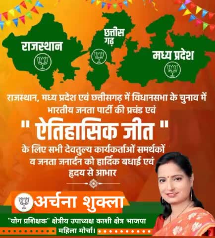 राजस्थान मध्यप्रदेश छत्तीसगढ़ में विधानसभा चुनाव में बीजेपी की प्रचंड जीत के लिए सभी को हार्दिक बधाई एवं हृदय से धन्यवाद